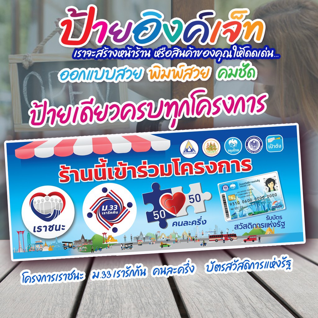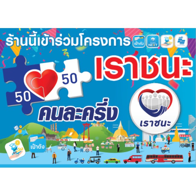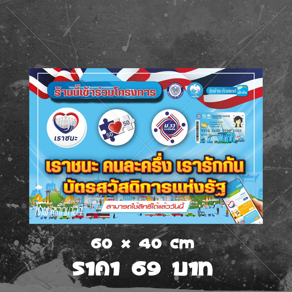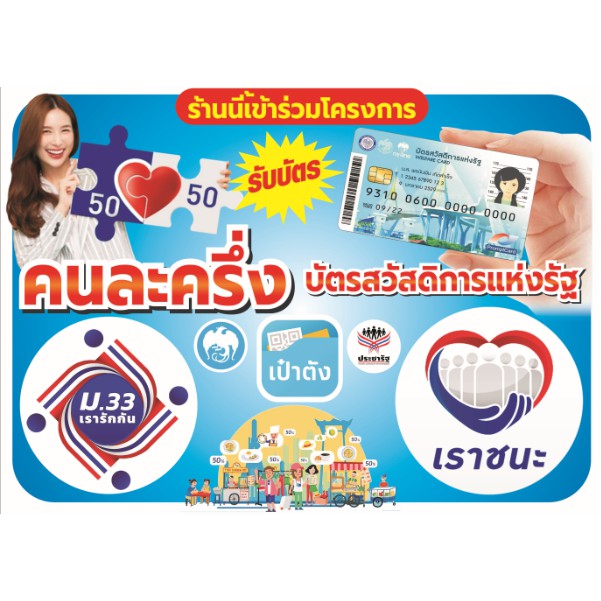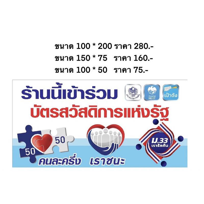 ป้ายรวมโครงการ คนละครึ่ง เราชนะ ม.33เรารักกัน บัตรสวัสดิการแห่งรัฐ(a31) มีหลายขนาดสีสดทนทุกสภาพอากาศ (เจาะตาไก่ 4 มุมสำหรับแขวน)